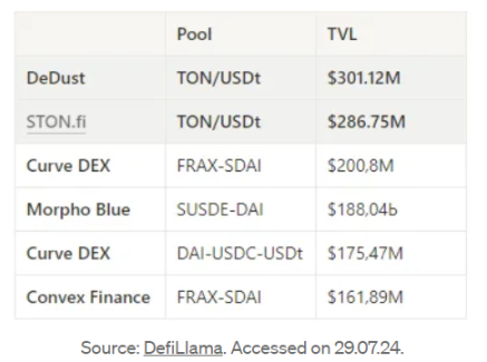2024 年 Q2,DeDust 和 STON.fi 的 TVL 分别增长 10 倍和 5 倍,其中大部分发生在 6 月。这一趋势与两个 DEX 上 TON/USDT LP 池的趋势相吻合。