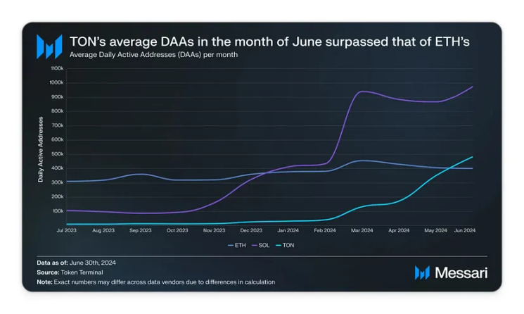 USDT-TON 的推出使得 TON 在 2024 年 Q2 TVL 增长 7 倍,其平均每日活跃地址(DAA)超越以太坊
