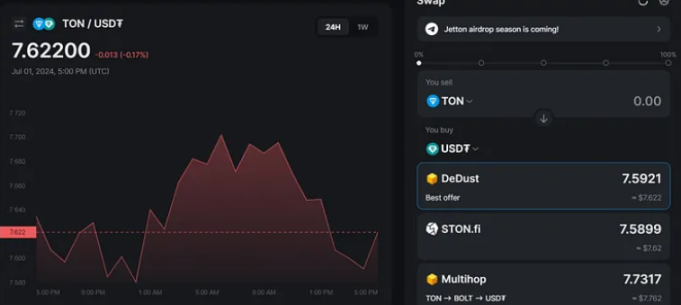 DEX Diamonds 是 jetTON DEX 聚合器,已推出其 Telegram Mini APP。该平台汇集了来自 STON.fi 和 DeDust 的流动性。像 DEX Diamonds 这样的 DEX 聚合器通过将来自多个去中心化交易所的流动性合并到一个平台中来运转。这种方法为用户提供了更好的代币价格和更低的滑点,因为与单个 DEX 相比,聚合流动性有所增加。此外,DEX 聚合器允许用户在各种 DEX 之间执行交易,而无需比较价格或手动浏览多个界面,从而简化了交易过程。这导致了更高效、更具成本效益和用户友好的交易体验,使交易者更容易找到最佳汇率并无缝执行更大的交易。