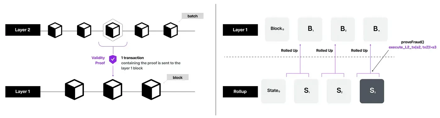 我们认为 rollups 是真正的 L2,因为每笔交易都有一个提交给 L1 的证明作为支持;这个证明可以直接在 L1 上进行验证。在 rollups 中,若干交易被 rollups 为 1 笔交易。然后,这笔交易连同有效性证明一起提交给L1。有效性证明表明:“嘿,我已经检查了这些交易,并且可以确认它们遵循所有规则。你可以检查我,并获得累积的确定性。你不需要逐个检查每一笔交易!”