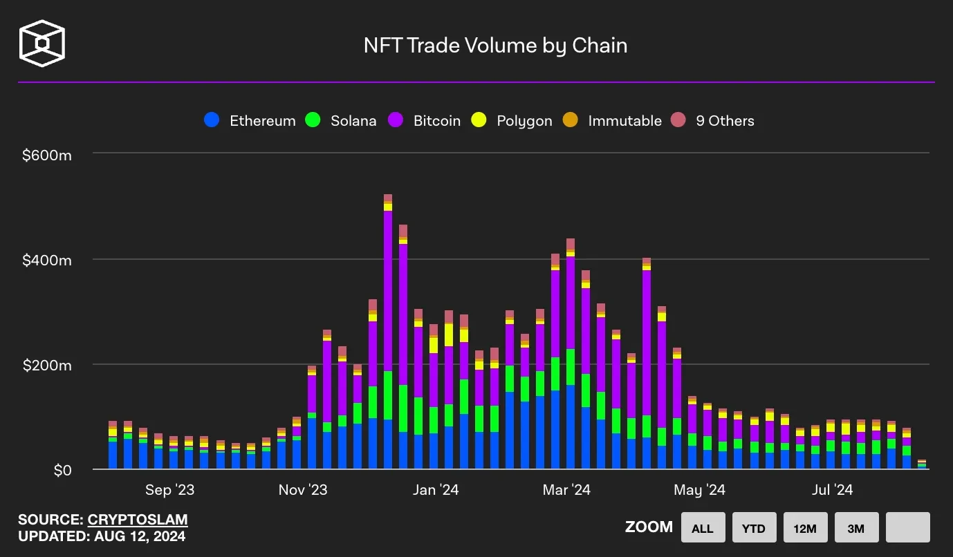这种热度的下降并非比特币 Ordinals 特有——这是整个 NFT 领域的低迷期(来源:The Block)