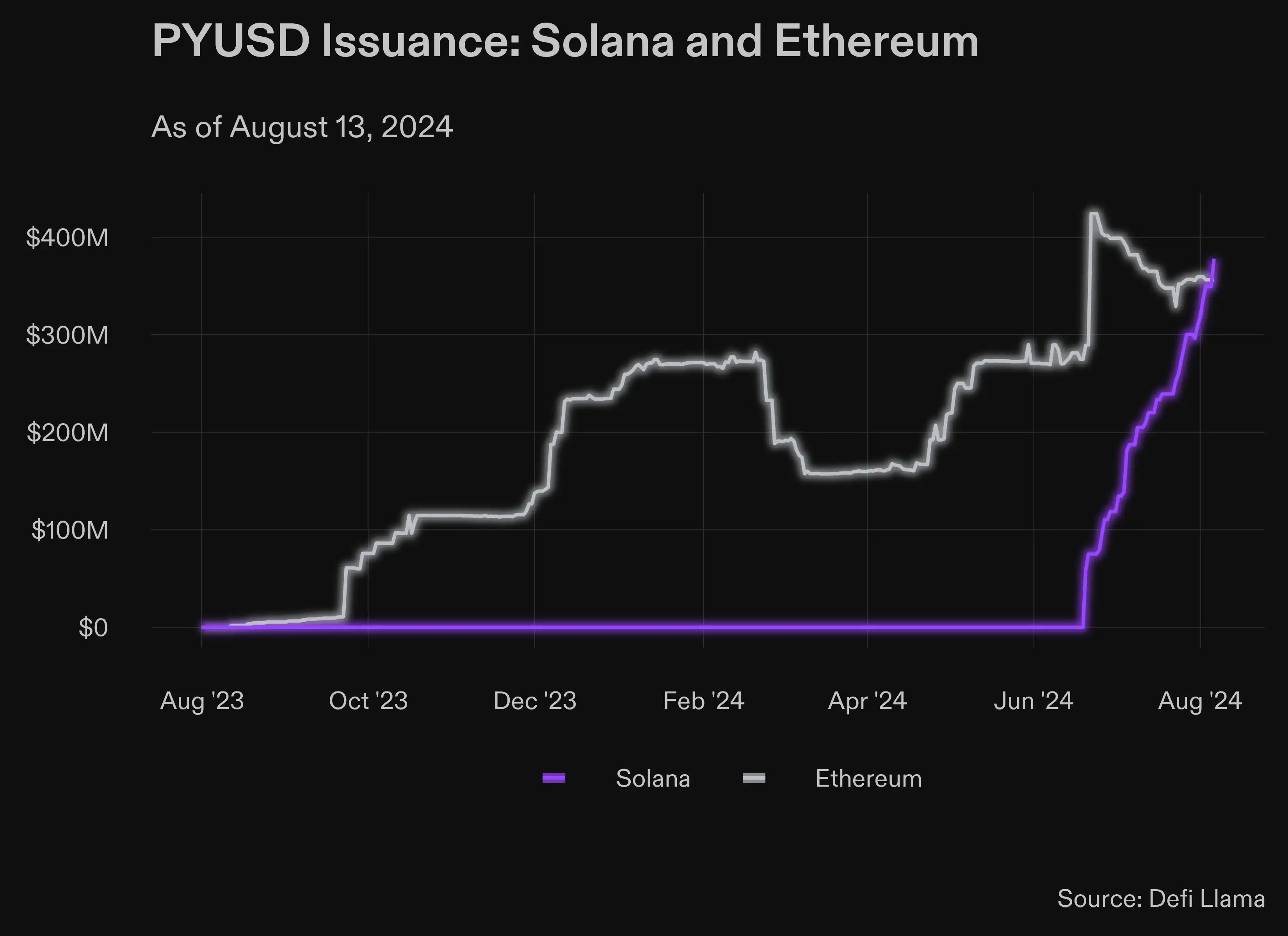 或许与近期 Solana 基金会大力推广支付和 PayFi 有关。根据社区的说法,Solana 链上 PYUSD 的高额激励是由 Solana 和 Paypal 共同提供,但目前尚未有关于补贴来源的明确声明。由于有 Paypal 的背书,再叠加高额的利息, 8 月中旬 Solana 链上的 PYUSD 的发行量超越 Ethereum,成为 PYUSD 最大的发行平台。