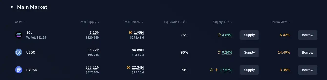 目前社区讨论度最高的稳定币理财项目是由支付巨头 Paypal 推出并由 Paxos 发行的美元稳定币 PayPal USD(PYUSD)。目前 PYUSD 在 Solana 链上的 APY 收益率普遍高于 15% ,以 Solana 最大的借贷平台 Kamino 为例, 3.2 亿 PYUSD 享受着 APY 17.57% 借款收益,另一家借贷平台 Marginfi 则拥有超 18% 的 APY 收益。