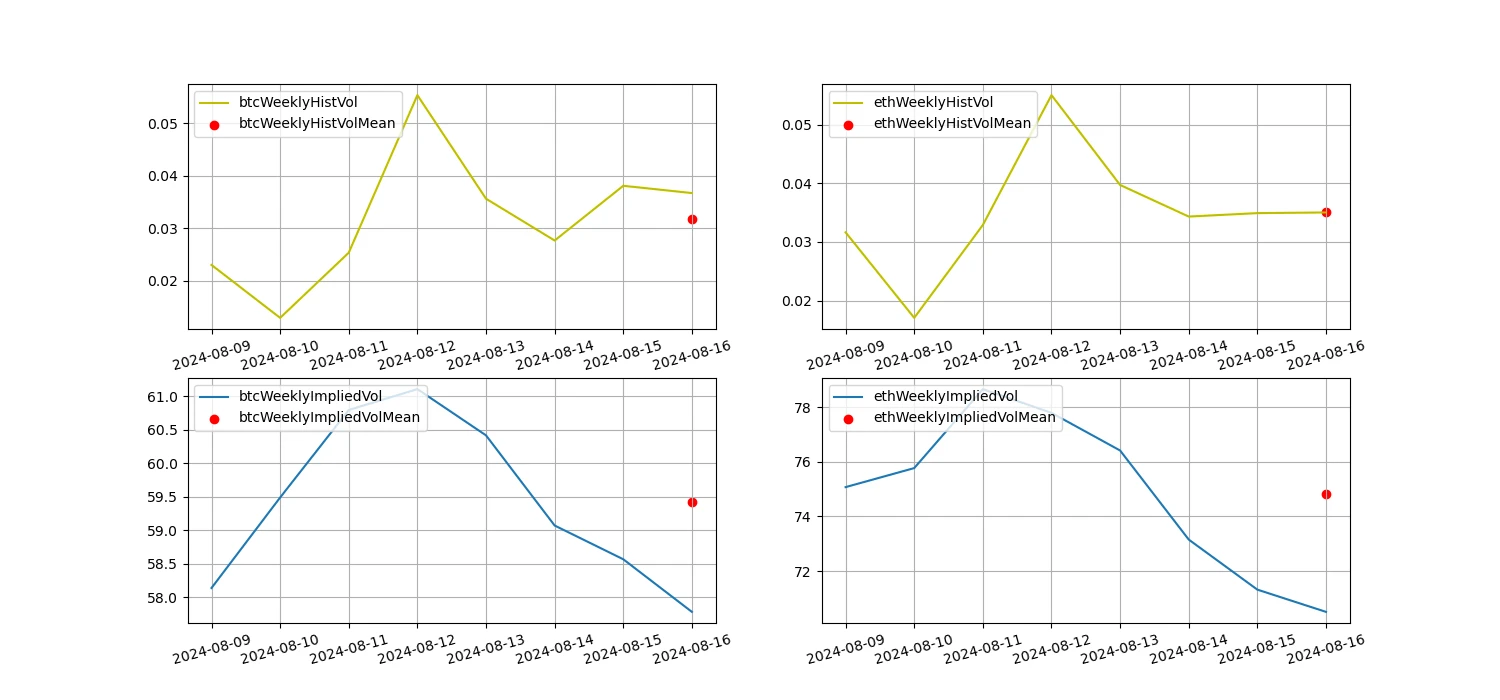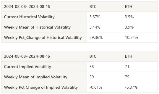 过去一周历史波动率 BTC 与 ETH 在 8.12 急跌反弹时最高;隐含波动率 BTC 和 ETH 都下降。
