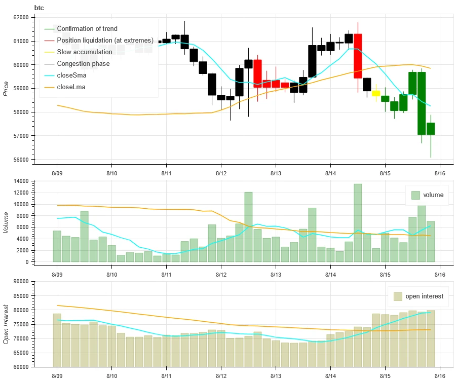 上图最上方 BTC 的价格走势,中间是成交量、最下方是未平仓量、浅蓝色是 1 天均值,橘色是 7 天均值。其中 K 线的颜色代表当前的状态,绿色是价格上升有成交量支持,红色是在平仓,黄色是在缓慢累积仓位,黑色是拥挤状态。