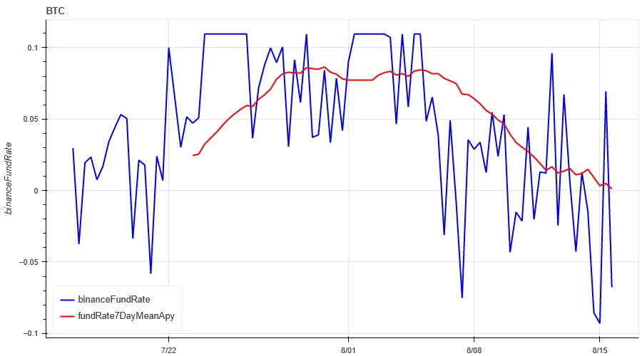 蓝色线为币安上 BTC 的资金费率,红色线为其 7 日平均