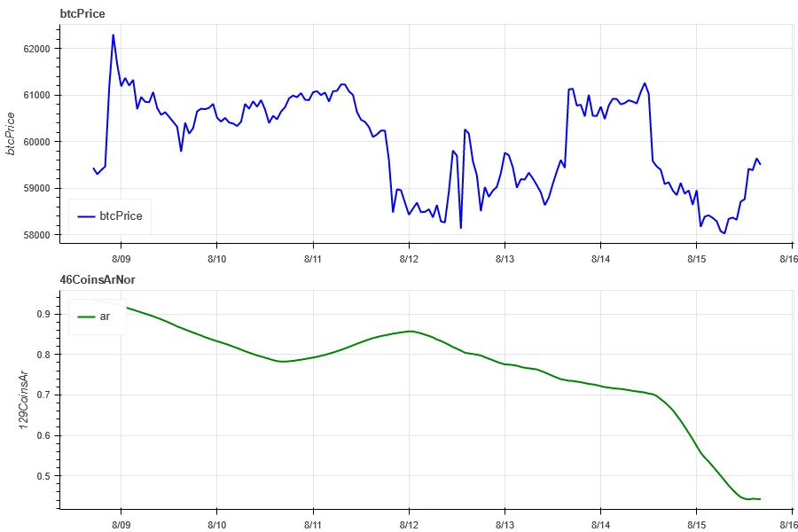 上图蓝色先为比特币价格,绿色线为['1000 floki', '1000 lunc', '1000 pepe', '1000 shib', '100 0x ec', '1inch', 'aave', 'ada', 'agix', 'algo', 'ankr', 'ant', 'ape', 'apt', 'arb', 'ar', 'astr', 'atom', 'audio', 'avax', 'axs', 'bal', 'band', 'bat', 'bch', 'bigtime', 'blur', 'bnb', 'btc', 'celo', 'cfx', 'chz', 'ckb', 'comp', 'crv', 'cvx', 'cyber', 'dash', 'doge', 'dot', 'dydx', 'egld', 'enj', 'ens', 'eos','etc', 'eth', 'fet', 'fil', 'flow', 'ftm', 'fxs', 'gala', 'gmt', 'gmx', 'grt', 'hbar', 'hot', 'icp', 'icx', 'imx', 'inj', 'iost', 'iotx', 'jasmy', 'kava', 'klay', 'ksm', 'ldo', 'link', 'loom', 'lpt', 'lqty', 'lrc', 'ltc', 'luna 2', 'magic', 'mana', 'matic', 'meme', 'mina', 'mkr', 'near', 'neo', 'ocean', 'one', 'ont', 'op', 'pendle', 'qnt', 'qtum', 'rndr', 'rose', 'rune', 'rvn', 'sand', 'sei', 'sfp', 'skl', 'snx', 'sol', 'ssv', 'stg', 'storj', 'stx', 'sui', 'sushi', 'sxp', 'theta', 'tia', 'trx', 't', 'uma', 'uni', 'vet', 'waves', 'wld', 'woo', 'xem', 'xlm', 'xmr', 'xrp', 'xtz', 'yfi', 'zec', 'zen', 'zil', 'zrx’]整体的相关性
