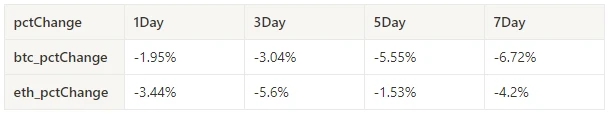 过去一周 BTC 价格下跌-6.72% ,ETH 价格下跌-4.2% 。