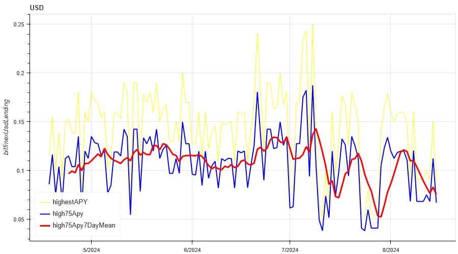 黄色线为 USD 利率的最高价,蓝色线为最高价的 75% ,红色线为最高价的 75% 的 7 天平均值
