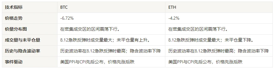 在过去一周,比特币(BTC)和以太坊(ETH)的价格呈现出震荡下行的趋势,尤其在 8 月 12 日急跌反弹时历史波动率与成交量达到峰值。BTC 的未平仓合约量有所上升,而 ETH 则下降。隐含波动率都有所下降。比特币在与黄金、纳指、恒指及沪深 300 的对比中表现最差,而纳指则表现最为强势。比特币的资金费率持续下降,反映市场参与者对其杠杆交易的兴趣持续下降。选中的 129 个币种之间的相关性维持在 0.45 左右,显示不同品种间的一致性从高位下降。市场宽度指标显示,整体市场中大部分加密货币仍处于下跌态势。PPI 数据在 13 号公布后行情开始上升,接着 CPI 数据在 14 号公布后行情开始下跌。