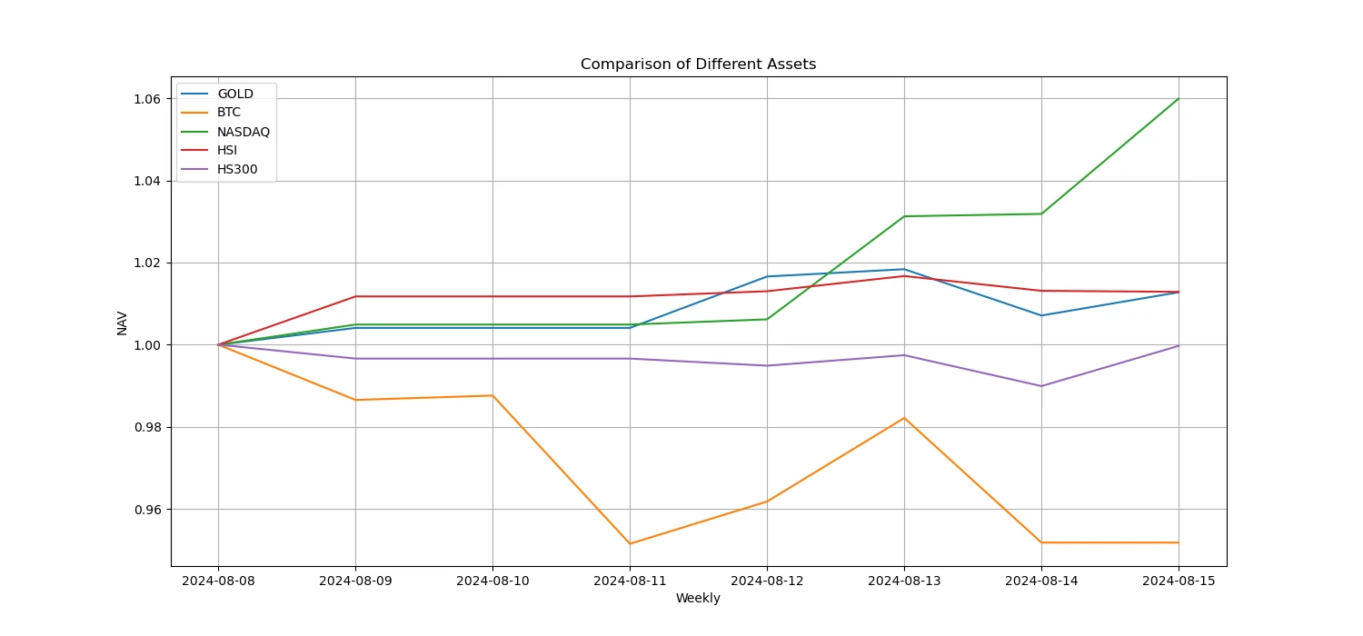 过去一周比特币/黄金/纳指/恒指/沪深 300 中,纳指最强势,而表现最差为比特币。