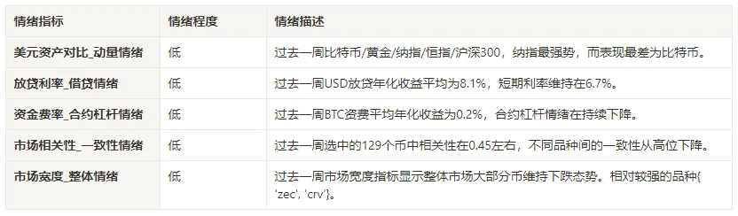 过去一周选中的 129 个币中相关性在 0.45 左右,不同品种间的一致性从高位下降。