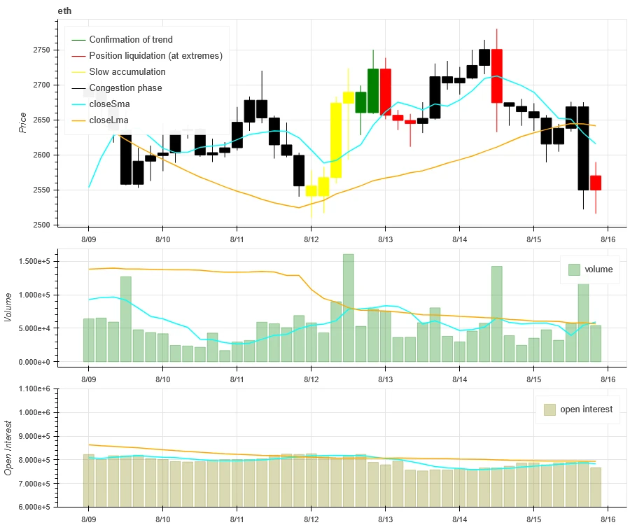 上图最上方 ETH 的价格走势,中间是成交量、最下方是未平仓量、浅蓝色是 1 天均值,橘色是 7 天均值。其中 K 线的颜色代表当前的状态,绿色是价格上升有成交量支持,红色是在平仓,黄色是在缓慢累积仓位,黑色是拥挤状态。