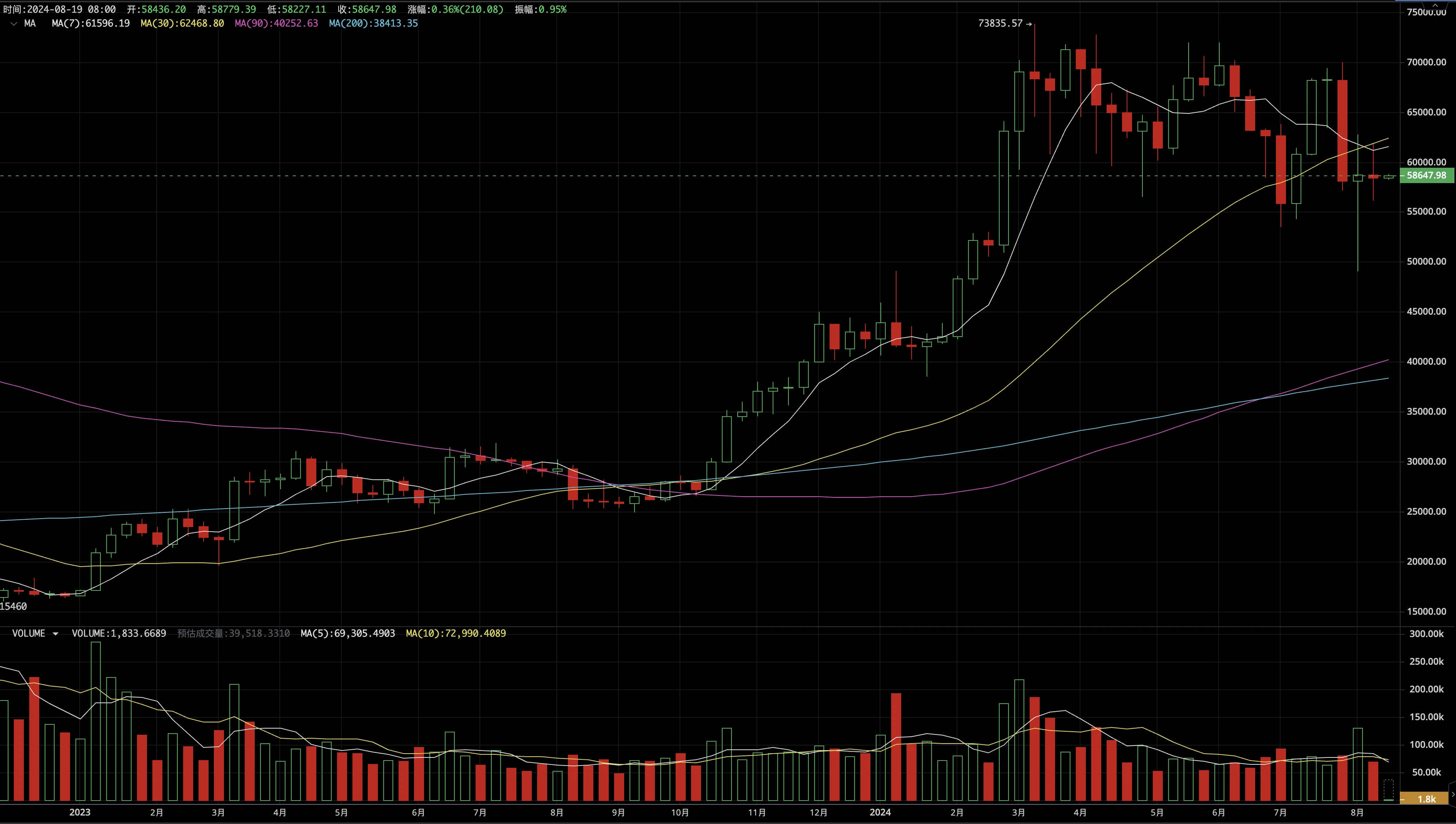 本周比特币开于 58717.44 美元,收于 58437.90 美元,最高 61827.20 ,最低 56120.00 美元,振幅 9.72% 。全周受制于周线和双周线压制,运行于牛市上升通道线之下,但仍在新高整理区之内。Coinbase 成交量较上周减少 55% 。