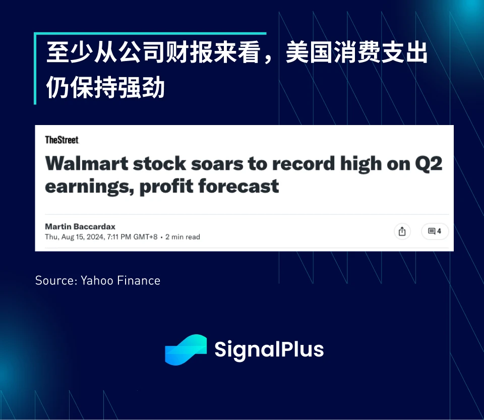 从个别企业来看,Walmart 的财报超出了市场预期,并上调了 2024 财年的指引,财报公布后股价上涨 7% 。其他消费品牌如 Home Depot 和 Starbucks 也表现良好,进一步缓解了市场对消费支出大幅放缓的担忧。