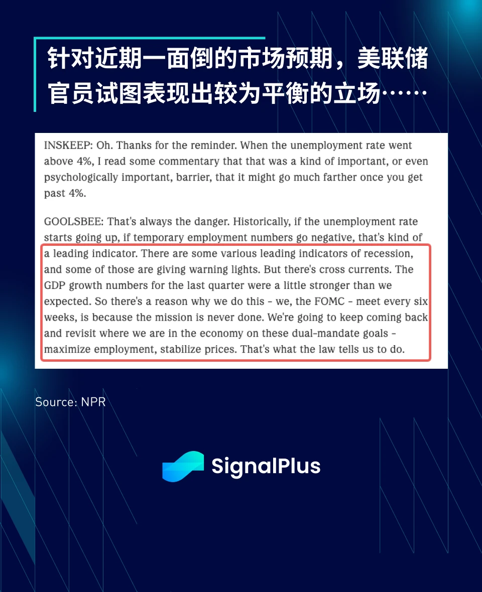 实际上,芝加哥联储著名的鸽派人士 Goolsbee 在最近的采访中表现出非常谨慎的平衡立场,称美联储不应对部分衰退指标做出过度反应,因此,即便市场殷殷期盼,Powell 仍有可能在万众期待的 Jackson Hole 会议上采取更中立的基调,使市场感到失望,也就是说,Powell 可能仅对开始逐步宽松的计划表达支持,同时在金融形势迅速放松的情况下淡化市场对降息 50 个基点的预期,他也可能强调不要关注单一非农业就业数据结果,同时保留在就业市场快速恶化时加快降息步伐的选项。
