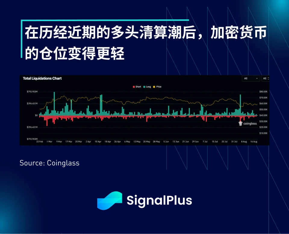 我们预计加密货币价格直到 9 月都将面临挑战, 9 月之后,宏观情绪的持续改善有机会拉高加密货币价格,特别是考虑到近期的多头清算后市场的轻仓情况,以及美联储终于即将开始采取降息措施。
