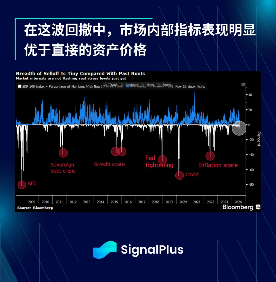 实际上,市场内部指标(以达到 52 周新高与新低的股票衡量)在这次波动中并未表现出太多恐慌,再次证实这波抛售主要是由头寸和盈亏止损所驱动,而非基本面长期观点的变化。