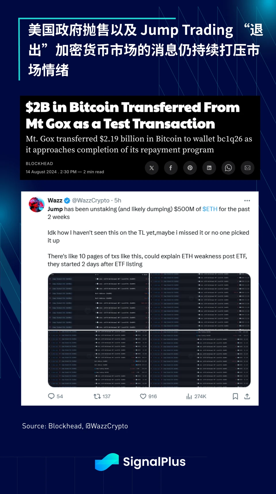 在加密货币方面,由于市场担忧抛售问题(Mt. Gox)以及 Jump Trading 退出加密货币市场的传闻,主要币种的价格表现仍落后于股票和其他风险资产。据报导,Jump Trading 持续将资产转移至中心化交易所,包括从 Lido 取回 1.7 万枚 ETH,可能是为之后的清算和套现做准备。