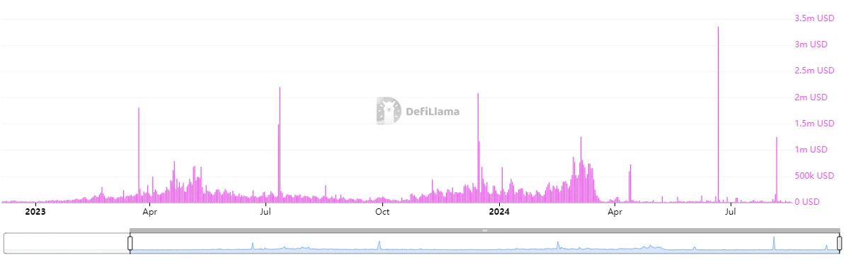 然而 DefiLlama 数据显示,Arbitrum 网络 过去 24 小时的收入仅为 6000 美元 ,自 3 月的坎昆升级后,除了少数几次出现偶然性爆发外,每日收入大约在 1-4 万美元之间波动。按照每日 3 万美元计算,一年的网络收入仅约为 1000 万美元,相较 ARB 18 亿美元的流通市值和近期每个月 6000 万美元的代币解锁杯水车薪。
