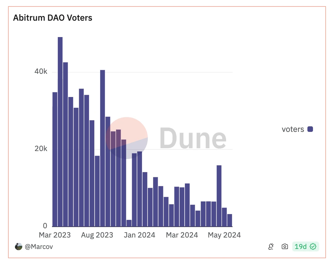 参与治理的 DAO 成员自 Arbitrum 代币上线以来持续下降。