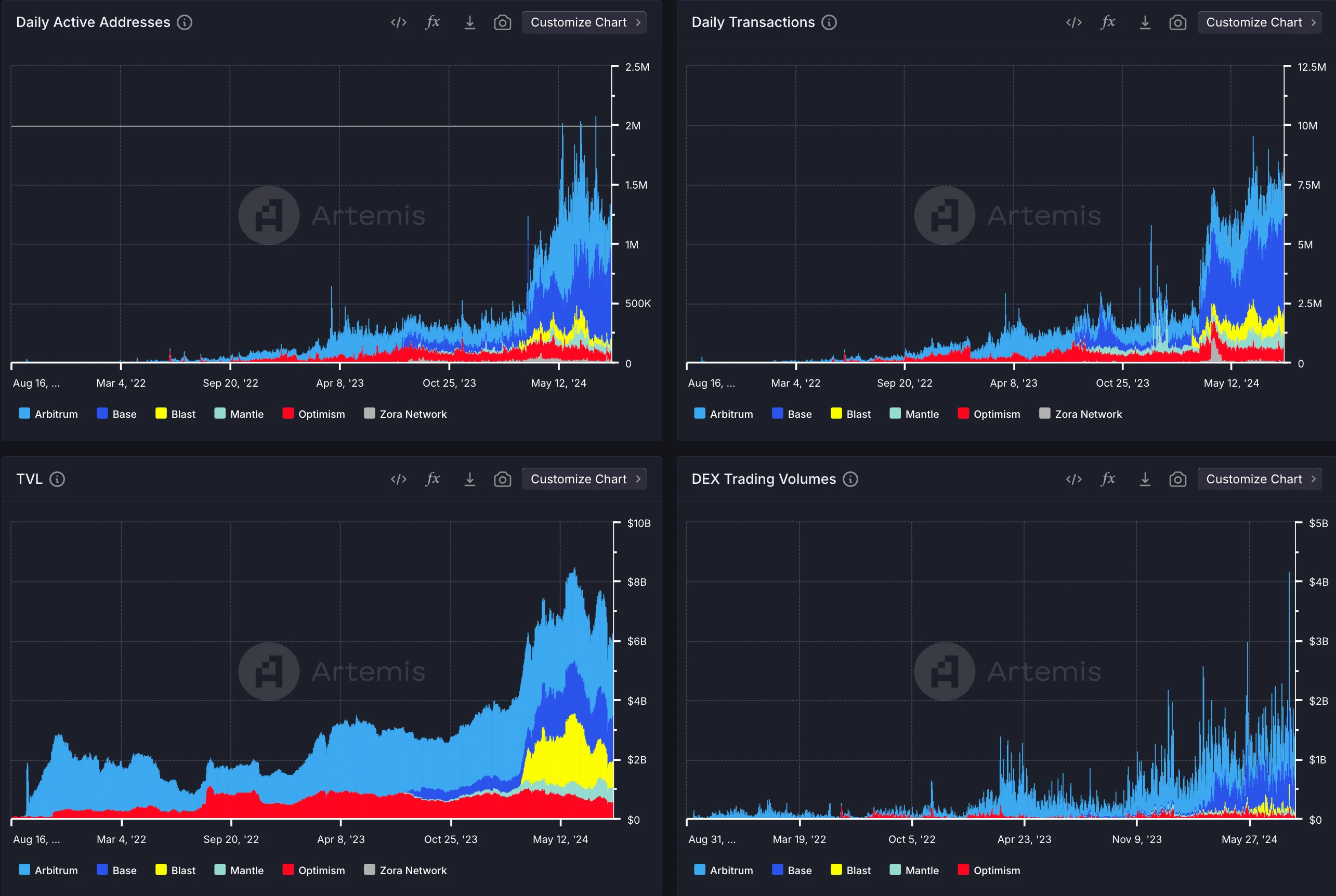 从常规指标来看 Layer 2 ,实际上其市场份额仍在高位横盘甚至略有上升,下图分别为几大 Layer 2 的活跃地址、每日交易量、TVL 和 DEX 交易量。