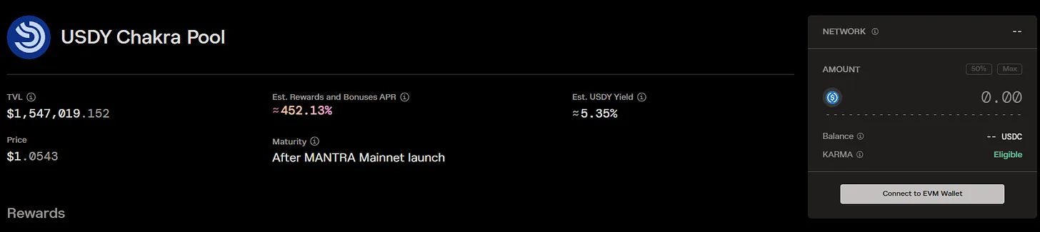 Mantra 宣布了其 Chakra 池,用户可以存入 USDC 以获得 USDY,这是一种超额抵押的国库券支持的稳定币,目前在 OM 和 ONDO 激励下的年化收益率为 452% 。