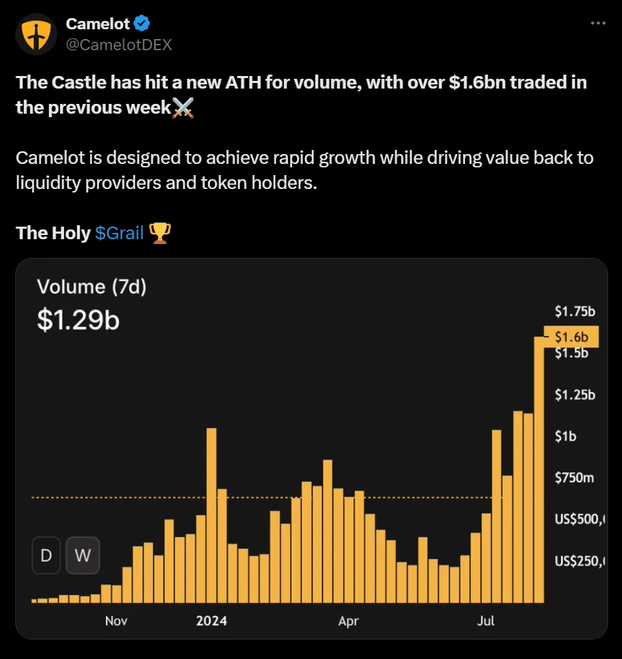 Camelot 最近随着 Arbitrum Orbit 链的推出(如 Sanko、Reya 和 Xai)而快速增长。