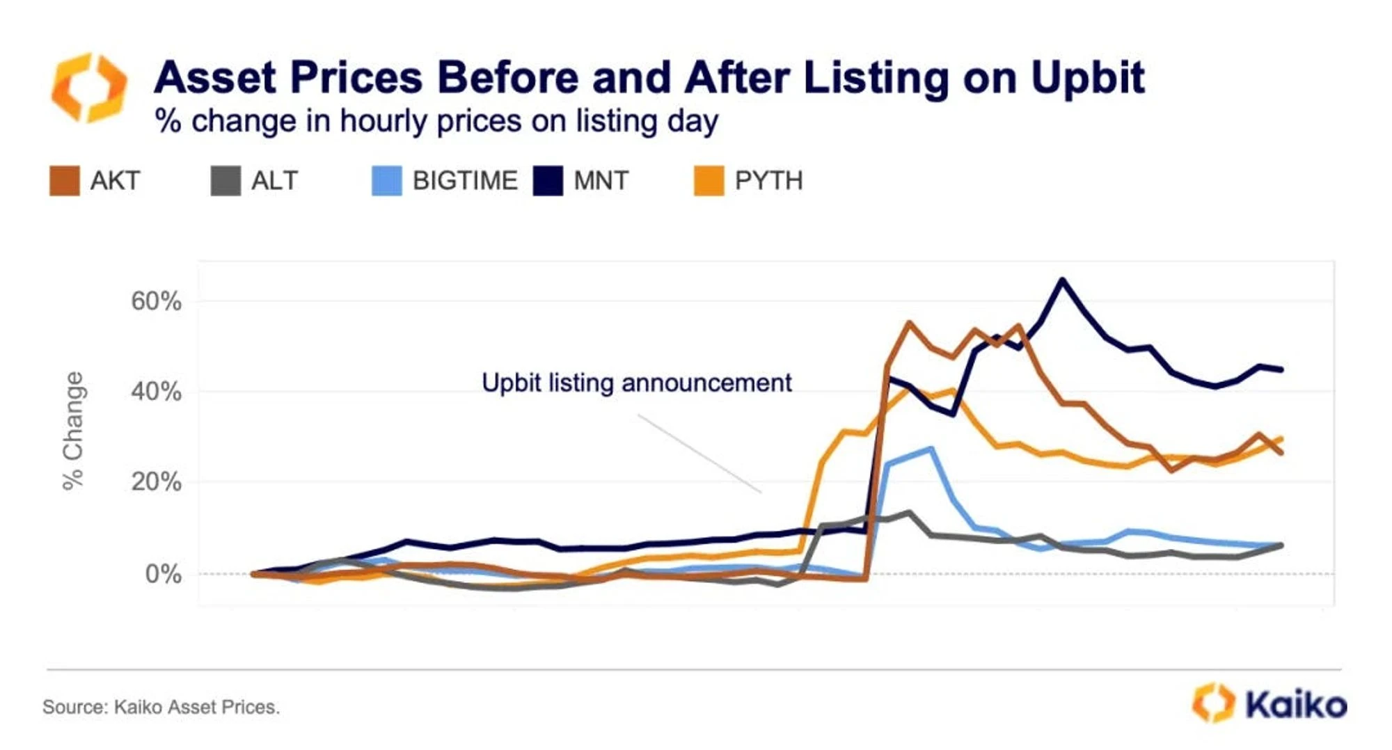 下图为一部分代币上线韩国交易所前后的代币走势情况,近年来 Upbit 的上架拉升效应非常明显