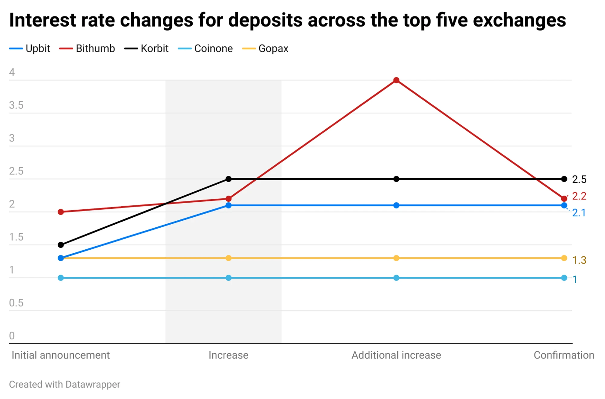 7 月 19 日至 20 日,《虚拟资产用户保护法》施行后不久,韩国五大交易所展开了激烈的利率竞争。从最初宣布的 1% 利率开始,一天之内利率上升至 2% , Bithumb 近期又将利率提升至 4% 。