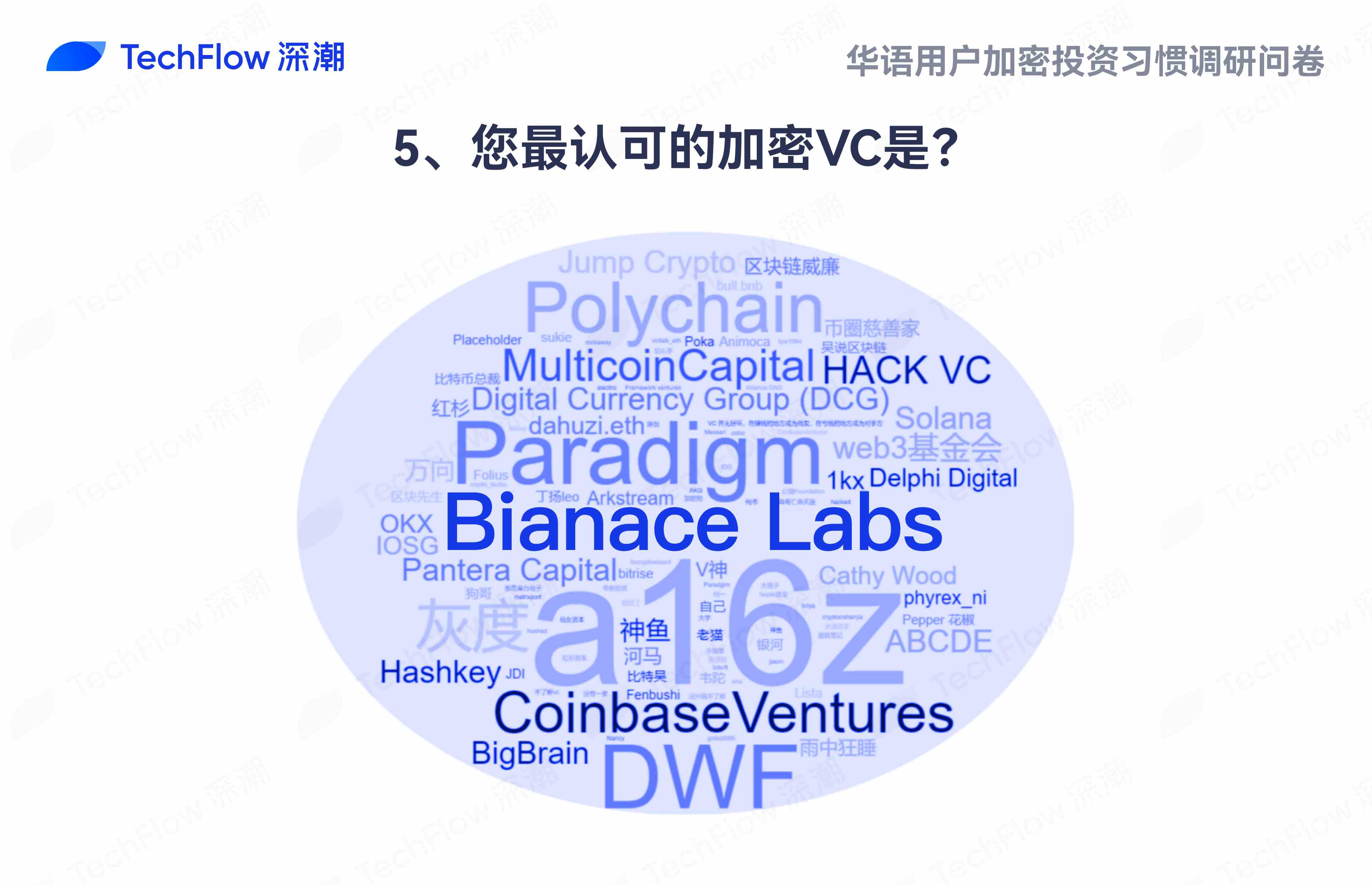 根据词云展示,我们可以观察到 a16z、Paradigm、Binance Labs、Coinbase Ventures 等老牌加密 VC 提及频率较高。