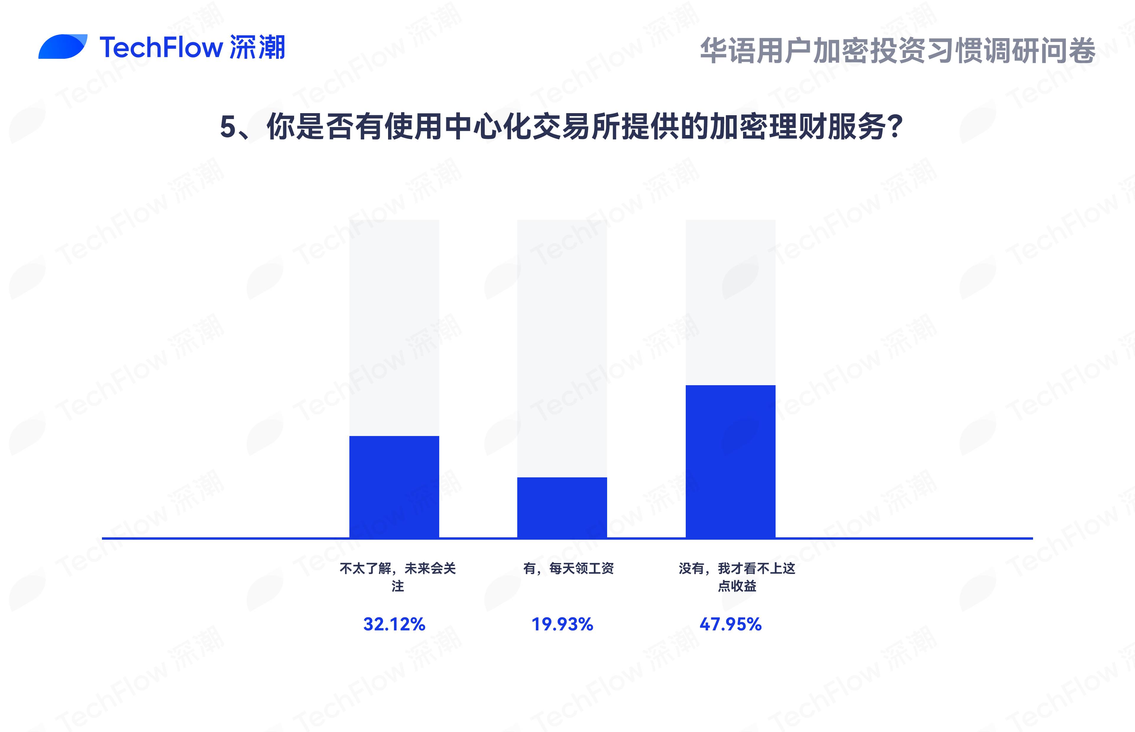 本次问卷调研中,我们对受访者是否使用中心化交易所提供的加密理财服务进行了详细统计,具体而言: