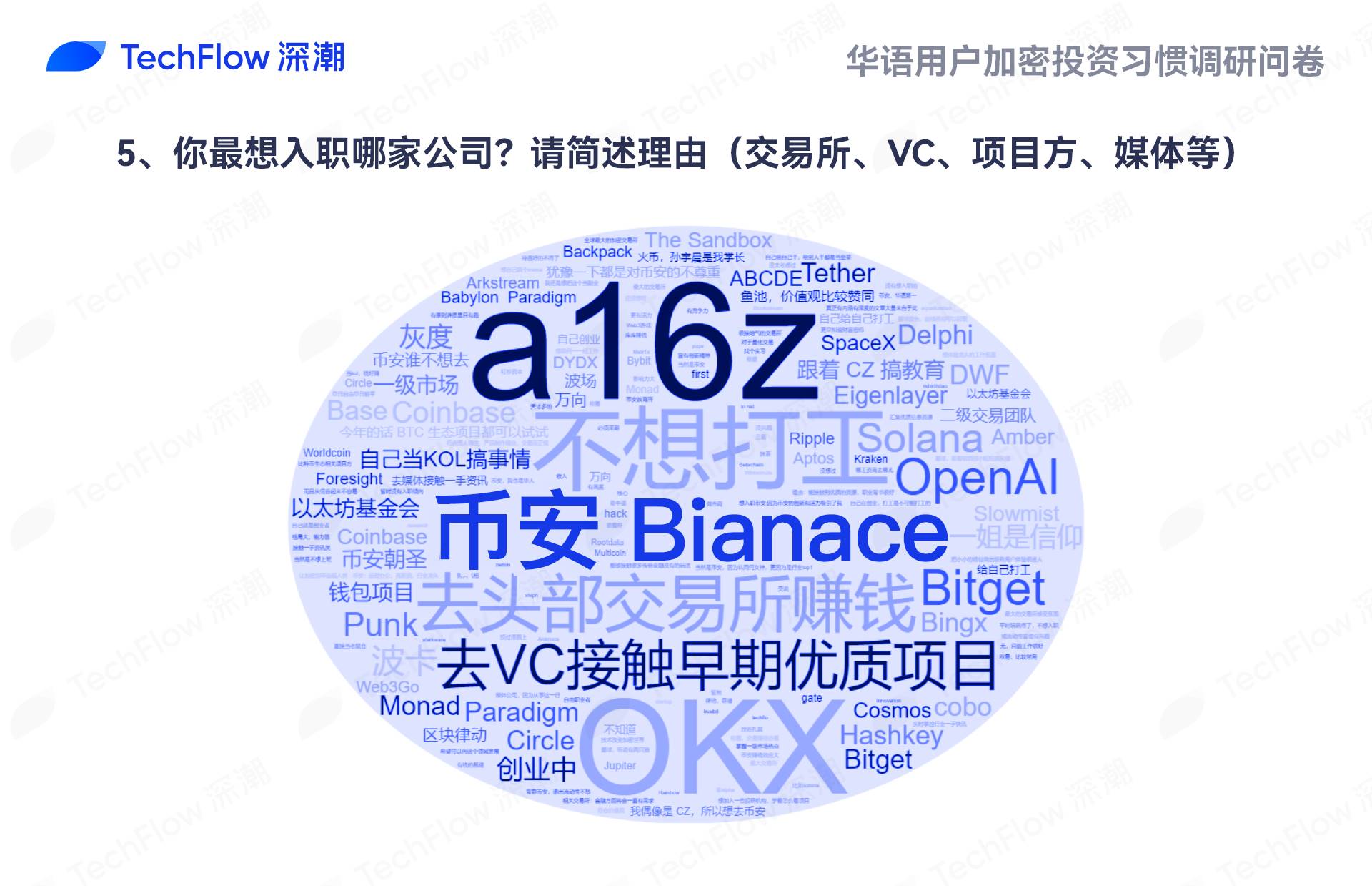 在收集到的反馈中,交易所是受访者最想入职的企业类型,大多数人的观点认为:交易所汇集优质信息资源,能够更早的接触到一些财富密码。而在交易所中,Binance 的提及率最高,受访者表示想要入职 Binance 的理由包括但不限于:头部交易所工资高;接触早期机会赚翻;华语顶流;想和一姐共事;周边产品很好看等等。其次 OKX 作为另一家华语主流交易所也被较高频率的提及,许多受访者对于 OKX 的产品体验、信息聚合等方面表达了肯定,且认为 OKX 对华人的招聘机会更多。