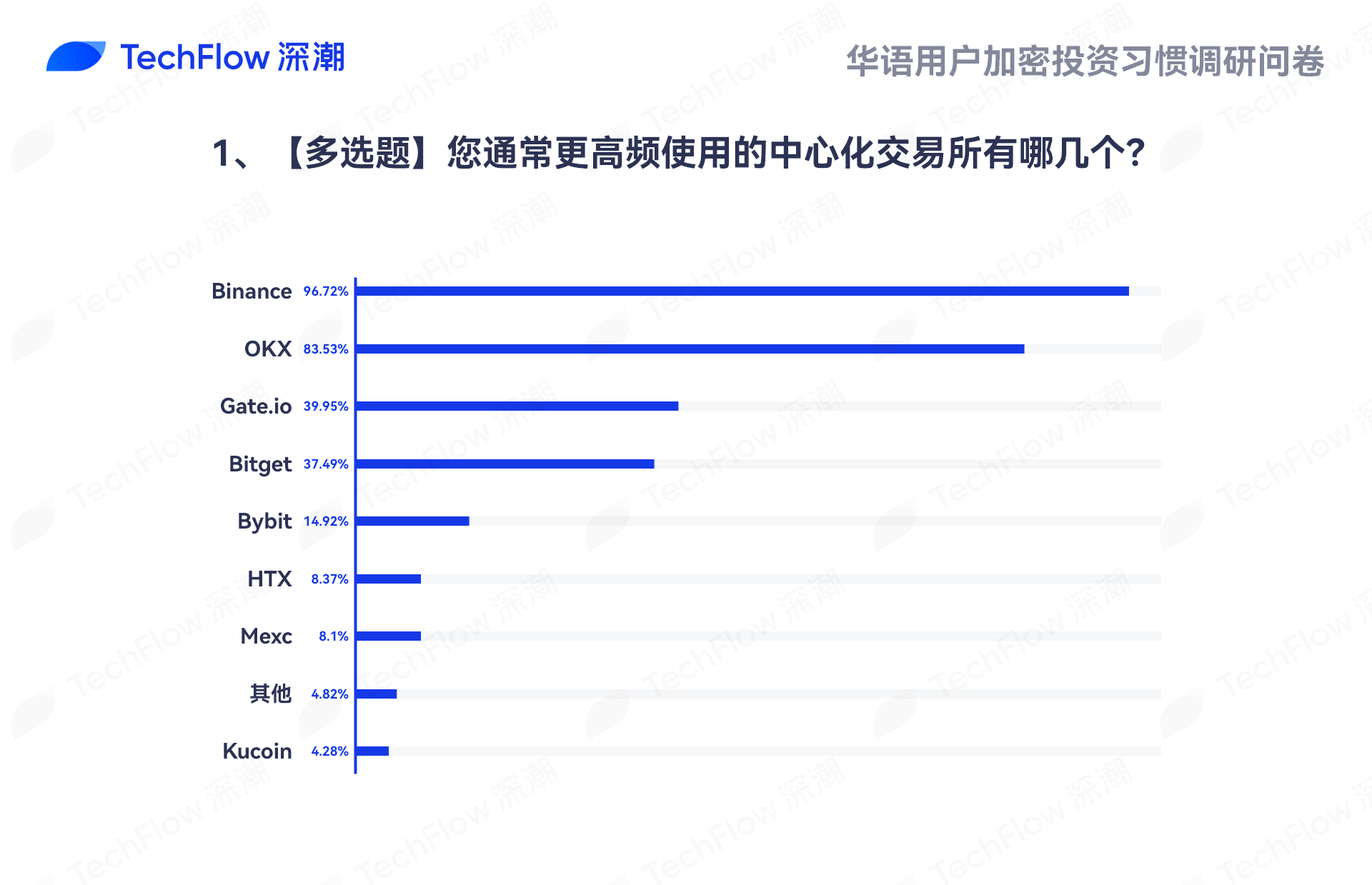 总的来说,Binance 是受访者中使用频率最高的中心化交易所,选择该选项的受访者达到惊人的 96.72%。这反映了 Binance 在华语加密市场中的强大影响力和用户基础。作为全球最大的数字资产交易平台之一,Binance 提供了丰富的交易对、低廉的手续费以及多样化的金融产品,被认为是投资者进入并参与加密市场的首选平台。