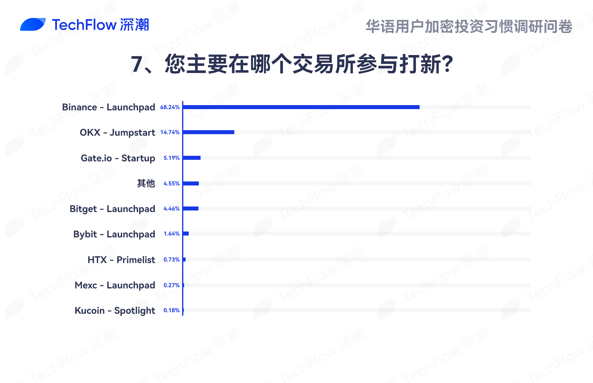 - 68.24% 的受访者选择 Binance 的 Launchpad 平台。这说明 Binance 的 Launchpad 在新项目发行方面拥有绝对的领先地位,成为大多数用户参与打新的首选交易所。