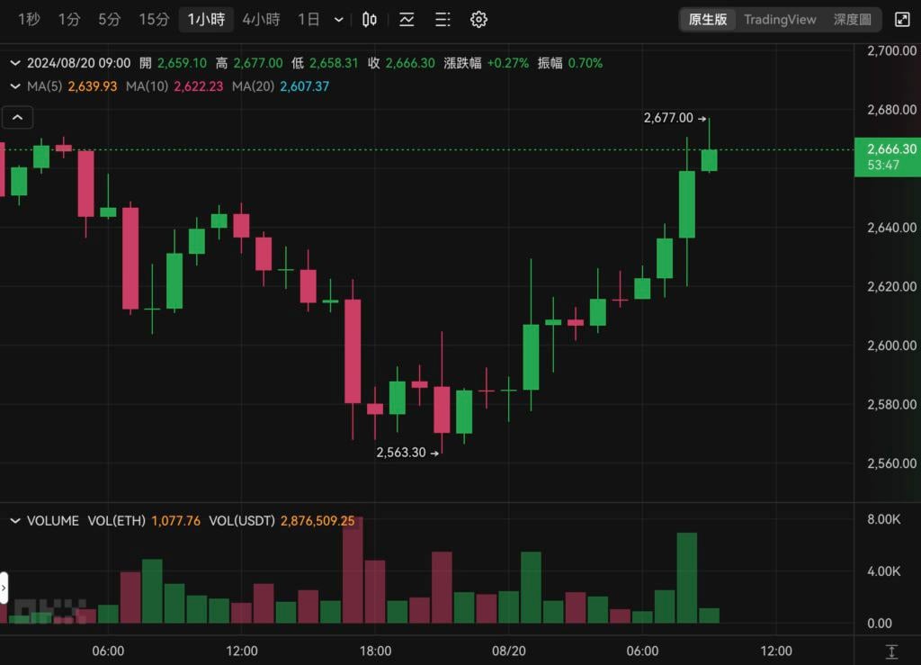以太坊走势与比特币雷同,昨晚最低触及 2,563 美元后转头向上,撰稿当下最高来到 2,677 美元。