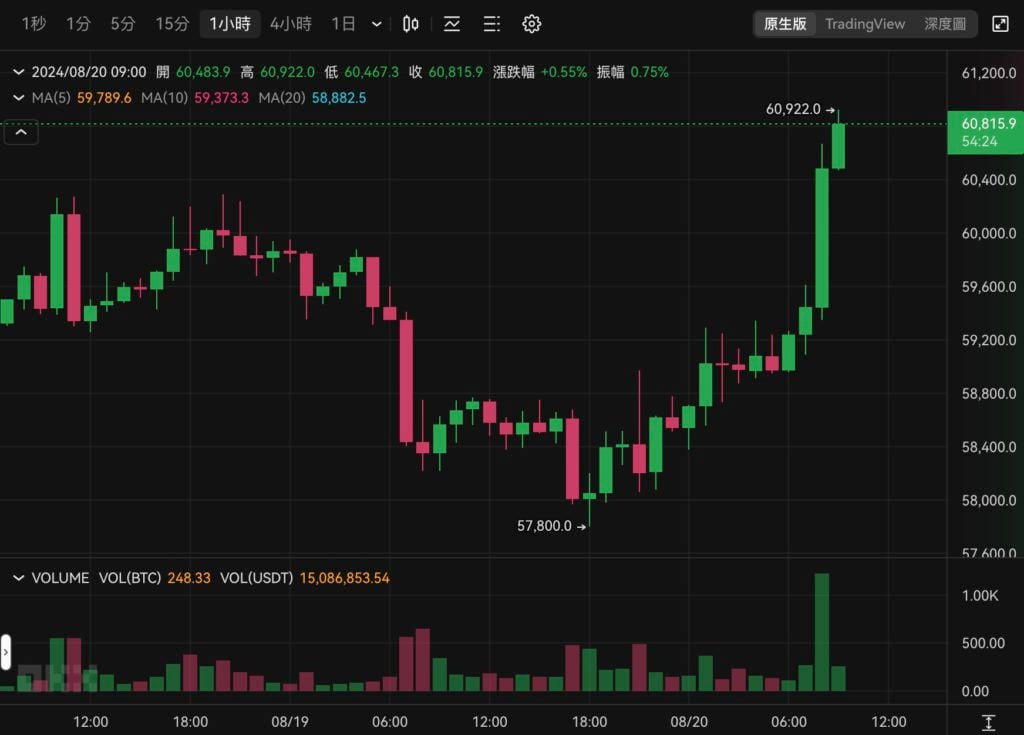 截稿前现报 60,815 美元,近 24 小时上涨 4.19%,目前来看似乎还没有出现快速下跌的假突破现象。