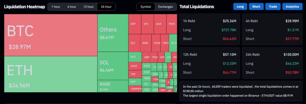 比特币突破六万美元的波动,目前来看似乎还在投资者的预测范围内。据 Coinglass 数据 显示,过去 24 小时,加密货币全网爆仓金额约 1 亿美元,不算特别多,有约 4 万人遭清算。