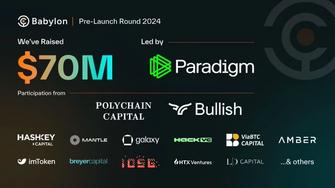 在今年 5 月末, Babylon 宣布完成 7000 万美元新一轮融资 ,Paradigm 领投,Polychain Capital、加密货币交易所 Bullish 的风险投资部门(也是 CoinDesk 的母公司)、HashKey Capital、Mantle、HackVC、ViaBTC Capital、Amber、imToken、Breyer Capital、IOSG、HTX Venture 和 LD Capital 参投。