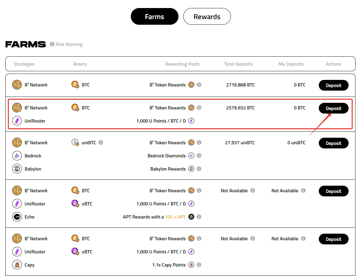 STEP 2. 质押 BTC,选择第二个 B² Network+UniRouter,点击 deposit 进行质押可以同时获得 B² Network+UniRouter+Babylon 三重奖励。( 点击此处跳转链接 )