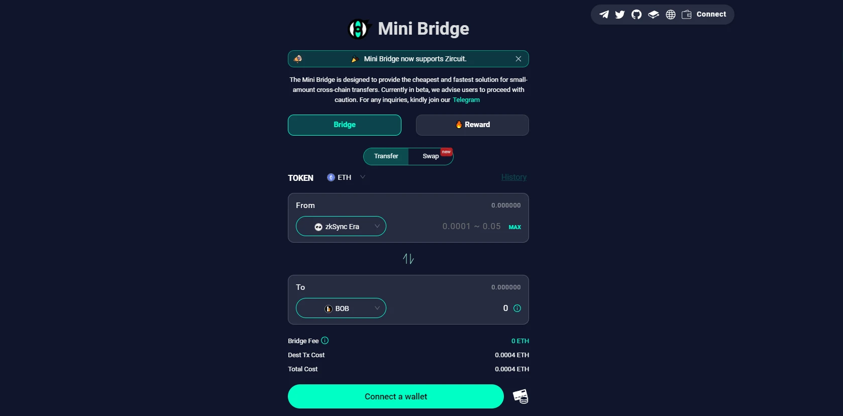 STEP 2. 任意链的 ETH 通过跨链桥跨到 BOB 链上,跨链网站: https://minibridge.chaineye.tools/ 。
