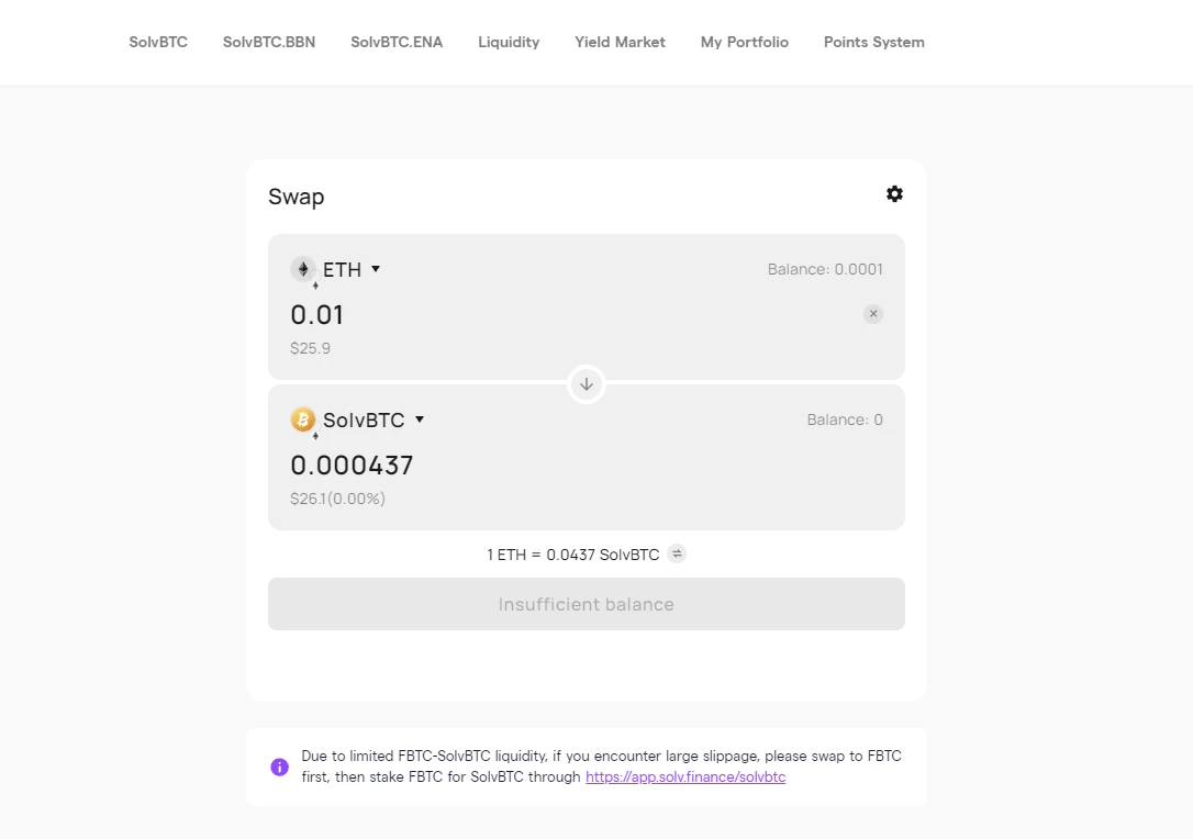 任务二: 在 Ethereum 获取 SolvBTC,需在 ETH 主网上最少兑换出 0.0001 枚 SolcBTC,兑换网站: https://app.solv.finance/swap