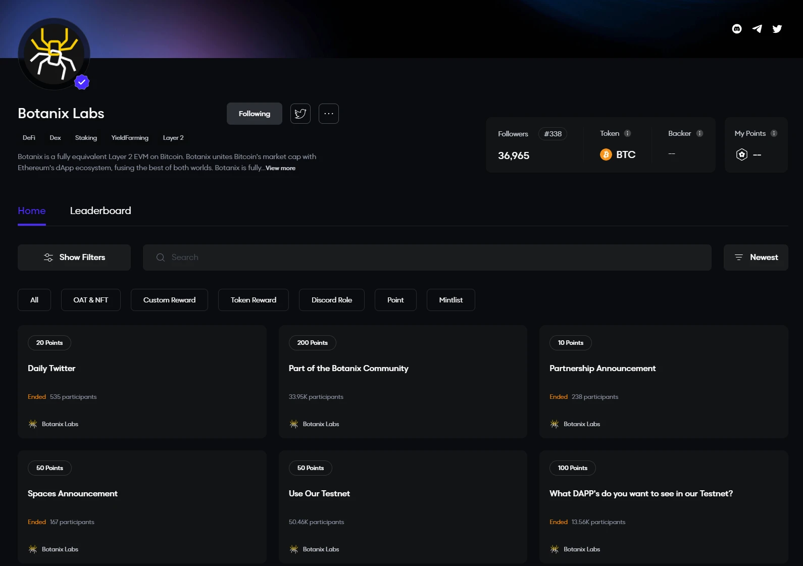 一方面,Botanix 在 Galxe 有任务,大部分为简单的社交任务,参与链接: https://app.galxe.com/quest/botanixlabs 。