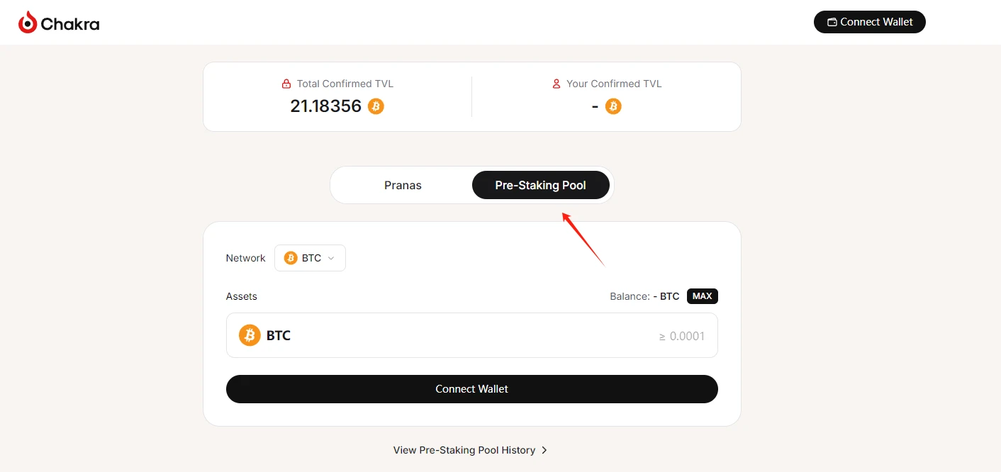 STEP 2. 质押 BTC,当前为预质押,最低存入 0.0001 枚 BTC,每存入 0.0001 枚 BTC,每日可以获得 1 个 Chakra Prana( 点击此处跳转链接 )。