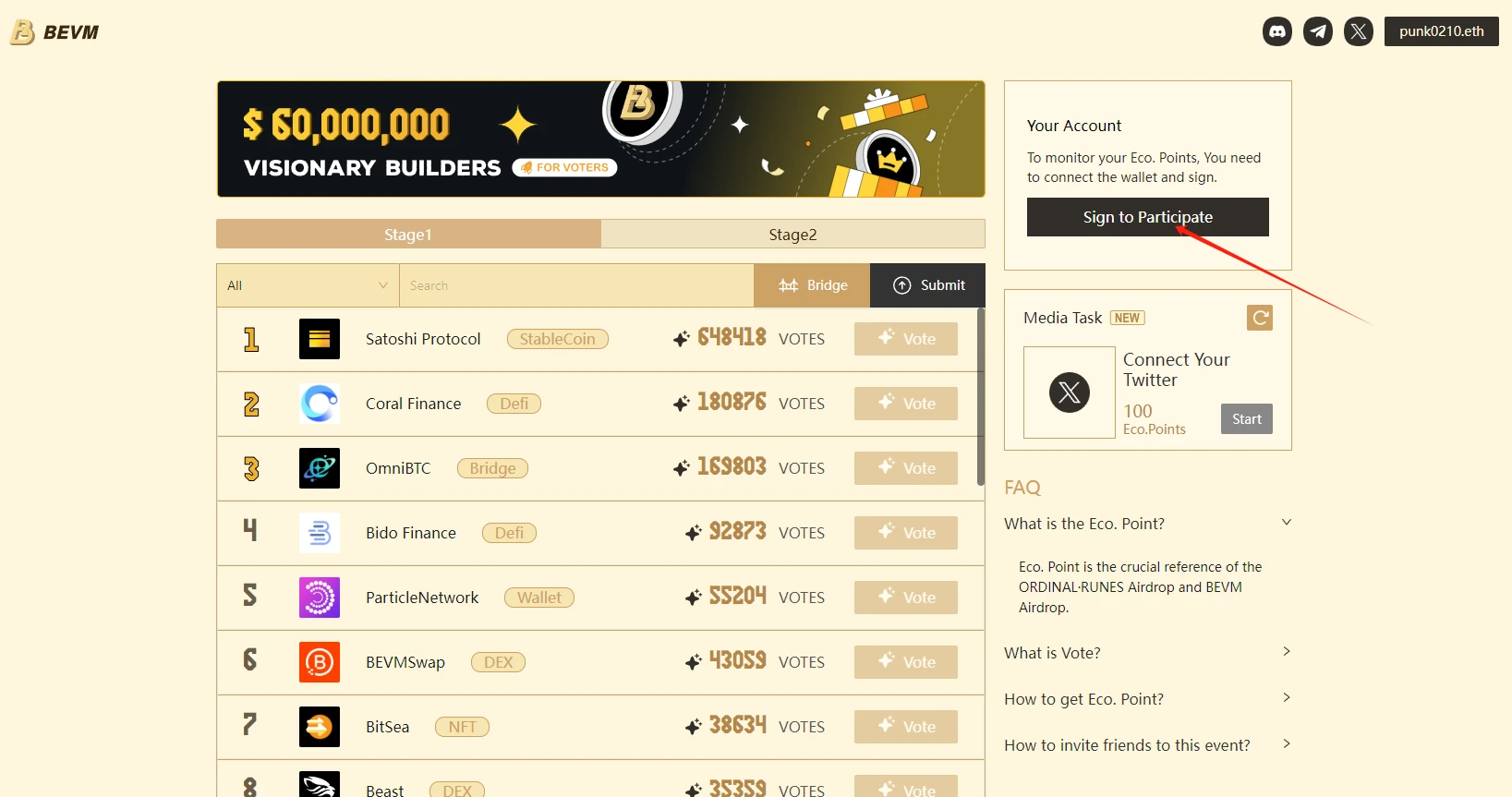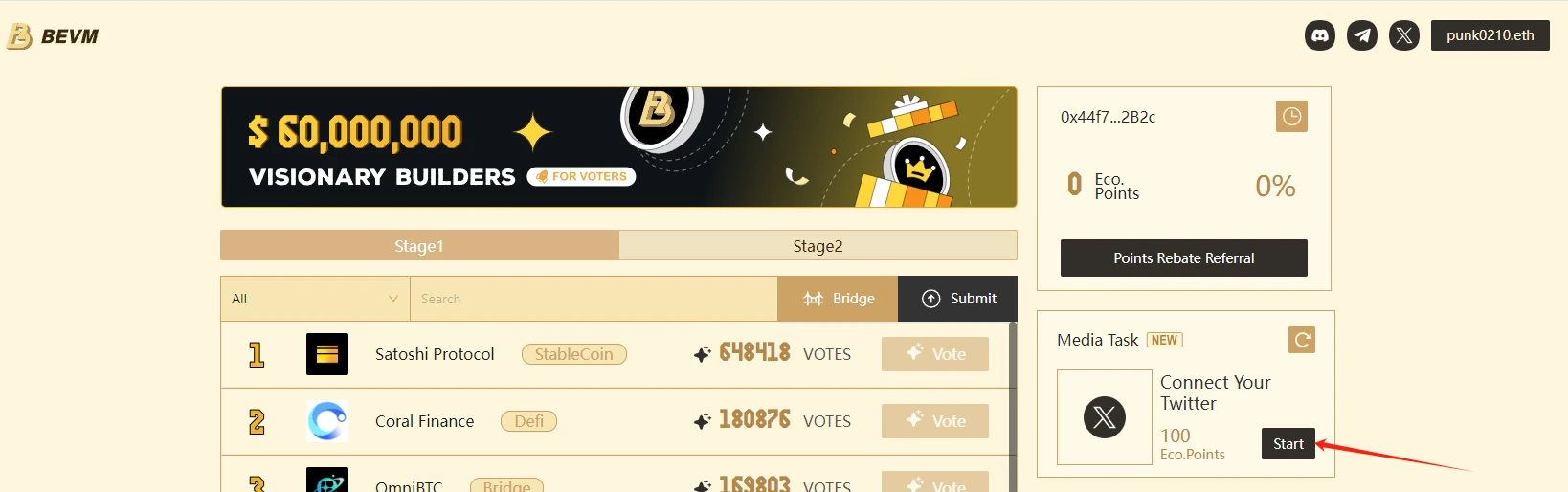目前可以参与的空投价值 6000 万美元的 BEVM Visionary Builders(BVB)活动,用户可通过完成简单社交任务、邀请好友的方式获得更多的 Eco. Points。