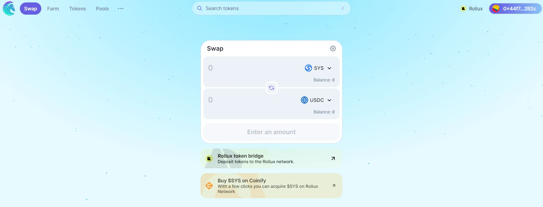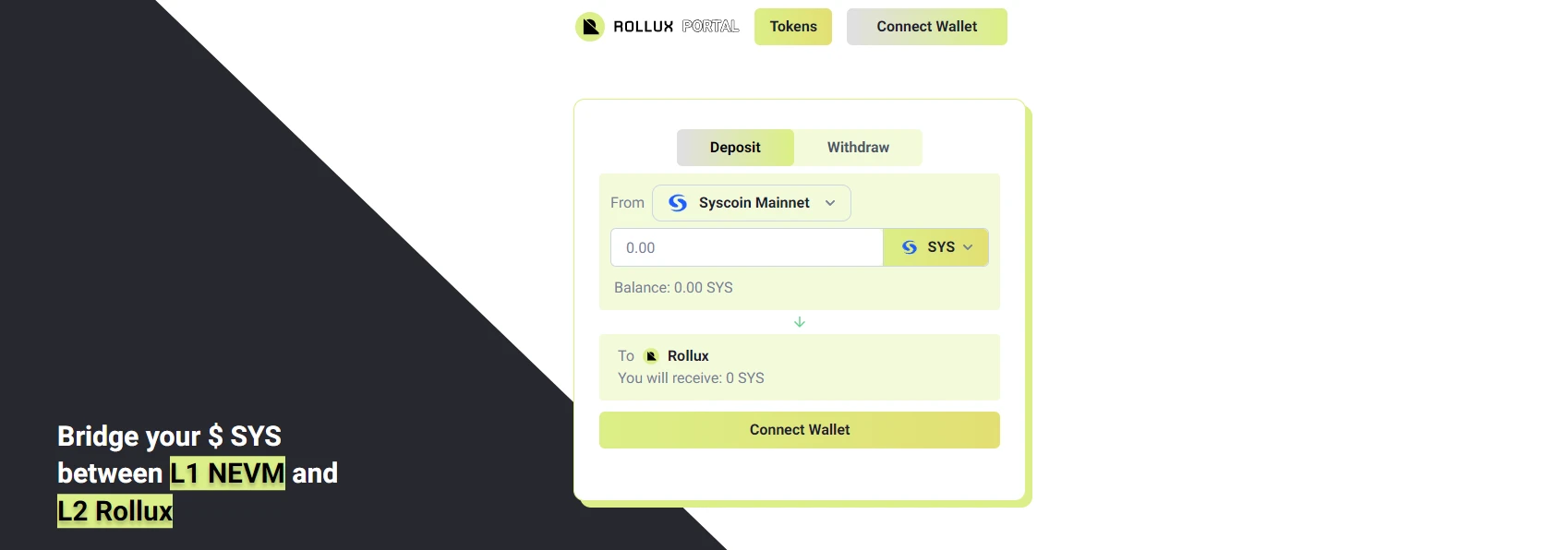 STEP 3. 通过 Rollux 的官方桥把 SYS 从 NEVM 跨到 Rollux 的主网上( 点击此处跳转链接 )