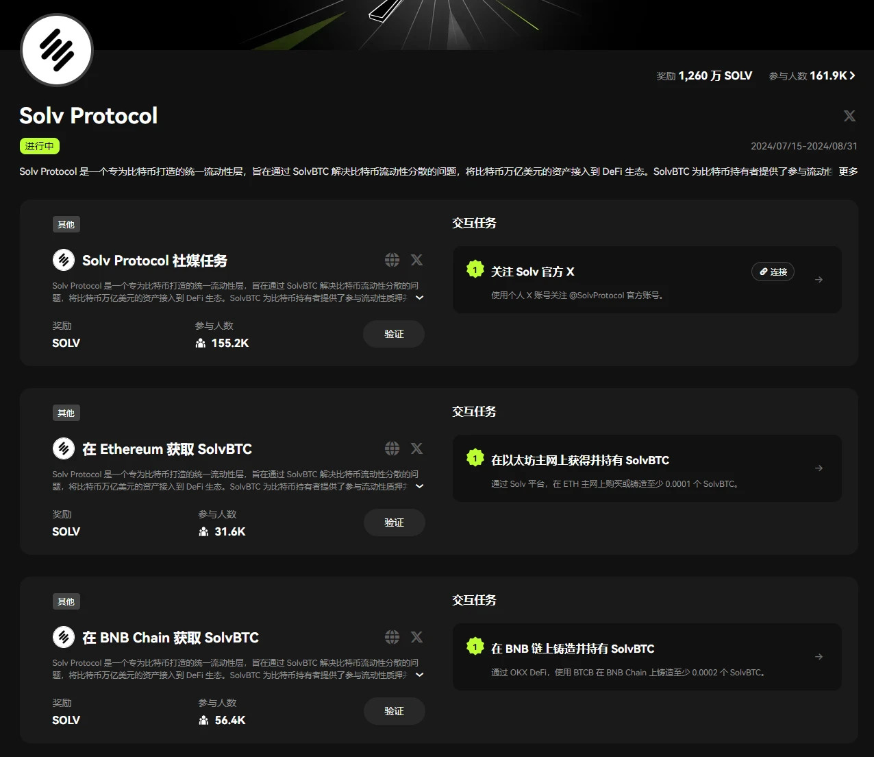 Solv Protocol 的交互任务为 OKX Web3 钱包第 21 期活动,共设置 3 个任务,参与活动的用户将有资格获得瓜分 1260 万枚 SOLV 代币,目前有超 16 万用户参与,活动将于本月底结束。