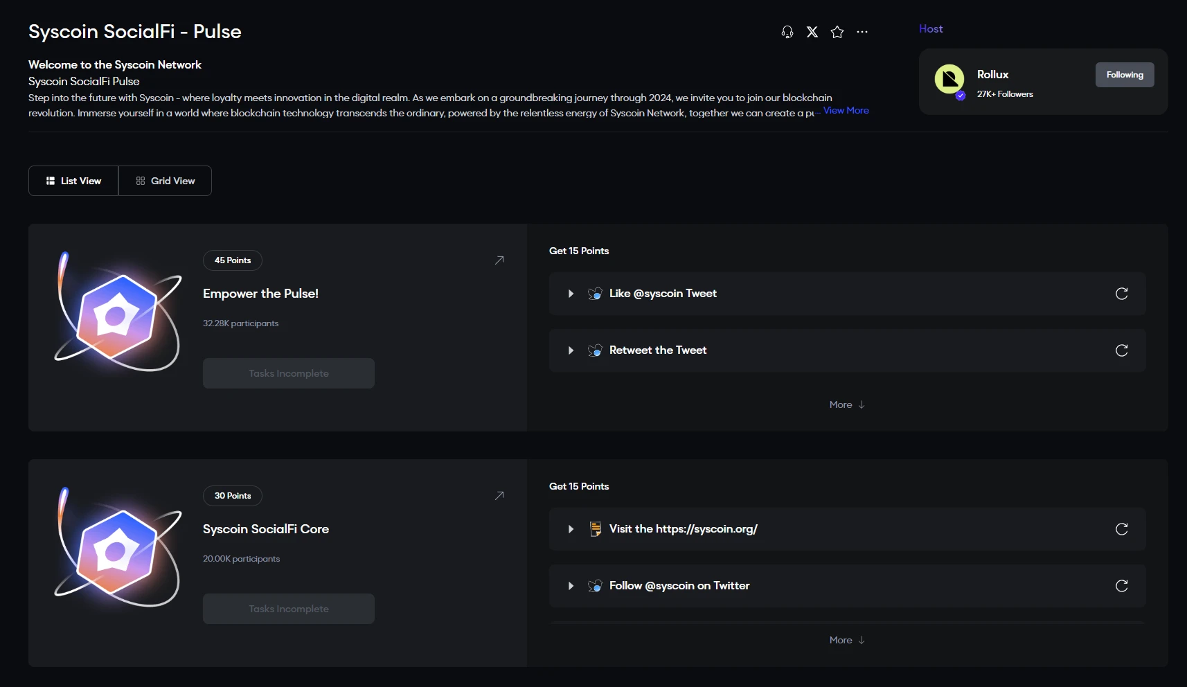 一方面是 Galxe 上的任务,大部分为转评赞推文、访问网站等基础任务,可参与,参与网站为: https://app.galxe.com/quest/rollux/GCWKCtttTj 。