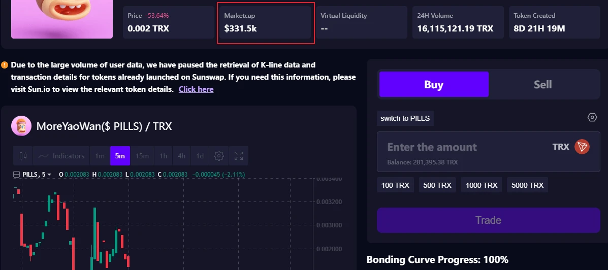 SunPump 的原生 K 线和进度模块目前存在数据有误、显示不全,若只在 SumPump 交易建议读者基于对应币种页面的 Marketcap 数据(如下图位置)判断交易进度。