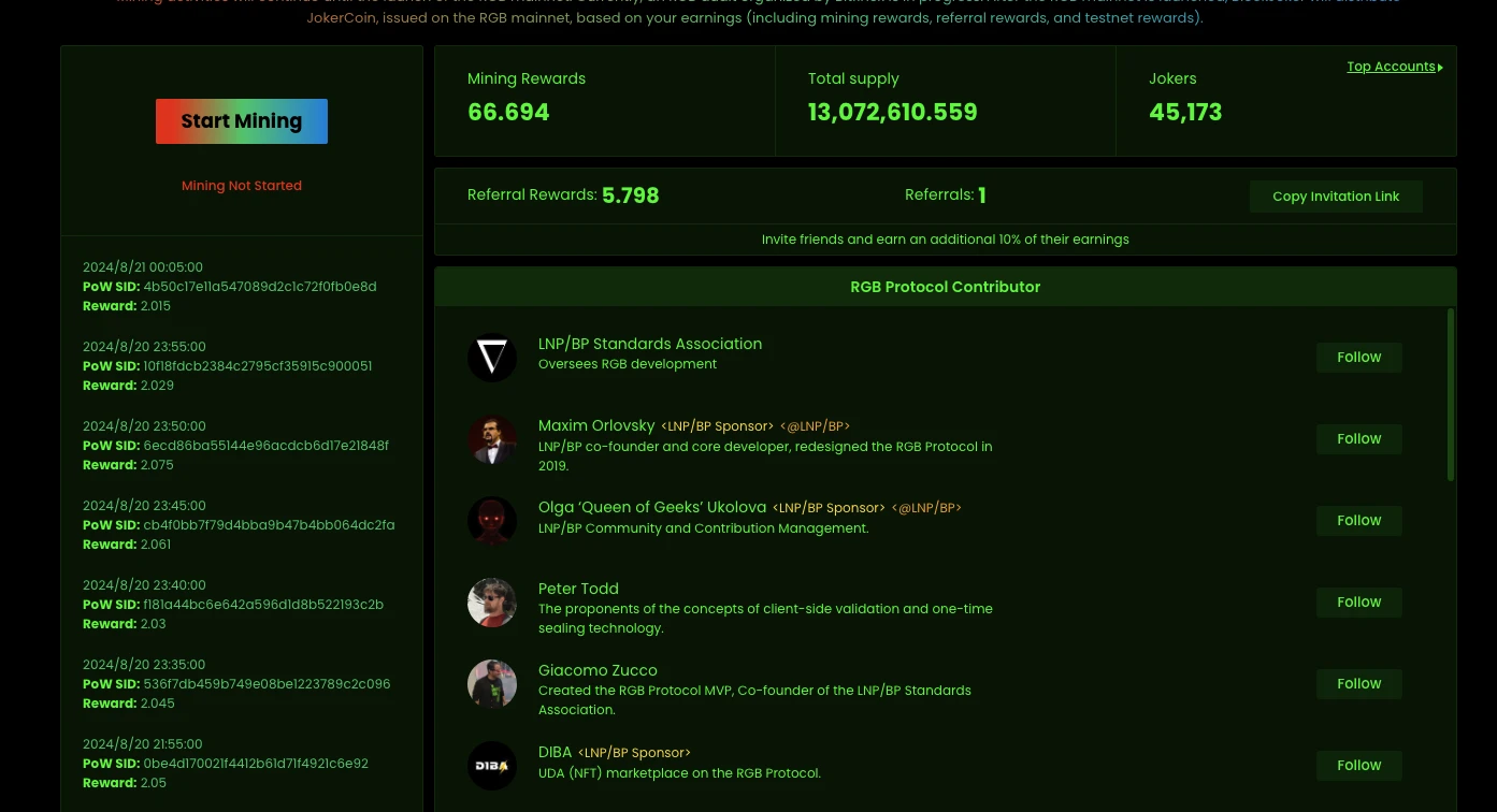 另一个则是采用 POW 免费挖矿方式发行的 Meme 项目 BlockJoker ,用户只需点击进入 官网 ,链接 X 账号,点击左上角开始挖矿即可。平均每 5 分钟产出 2 至 3 个代币,目前全网共有超 4.5 万个节点参与挖矿,同时 BlockJoker 的挖矿将持续到 RGB 主网启动为止,因此其总量并不确定。
